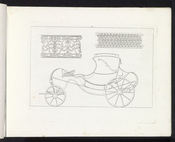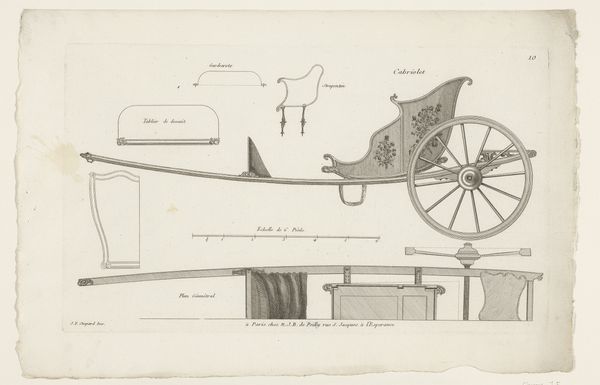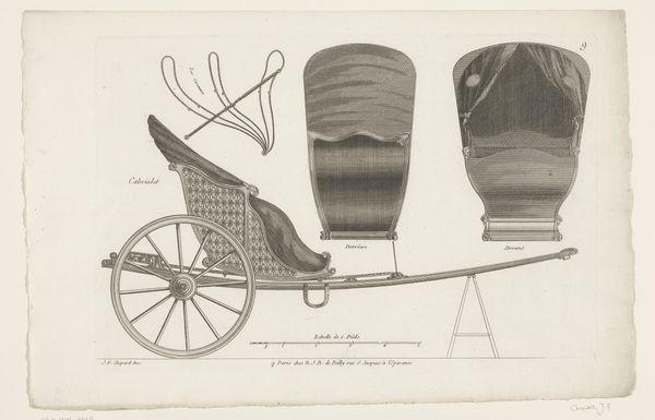 Curator: At first glance, it seems so light, ethereal, like a dream spun out of wire and lace. I see elegance defined in every curve. Editor: Let’s take a closer look. This is an engraving titled "Calèche," dating back to somewhere between 1740 and 1758. It appears to be a design or schematic. Curator: Exactly! Notice the strategic use of line and the way the artist has delineated form through intricate detail. The emphasis is on clarity and precision rather than atmospheric effect. Editor: Absolutely, that decorative-art focus. I wonder what riding in that would be like? Look at that woven seat. I imagine it's meant to signify both status and an experience—to float down cobbled streets, detached yet undeniably present. Curator: I would posit the structure reinforces aristocratic ideology by emphasizing order and control. Semiotically, the geometric structure implies social hierarchy and refinement. Editor: Or maybe just a bouncy ride and a chance to see and be seen? Isn't there also something charming about these glimpses into the past, a tangible record of imagination? Curator: Indeed, that's very insightful, that this work encapsulates that very essence: an attempt to immortalize ideas, making us witness across vast time spans the visual culture of the high Baroque era. Editor: Right, like this isn't just about an object; it's about a specific world, isn't it? Where form isn't merely function, but elaborate expressions. Curator: In conclusion, considering both the inherent structural elements and its placement within its cultural milieu allows for a thorough interpretation of its multifaceted nature. Editor: So, here's to daydreaming in carriages we'll likely never ride in, brought to life by art.