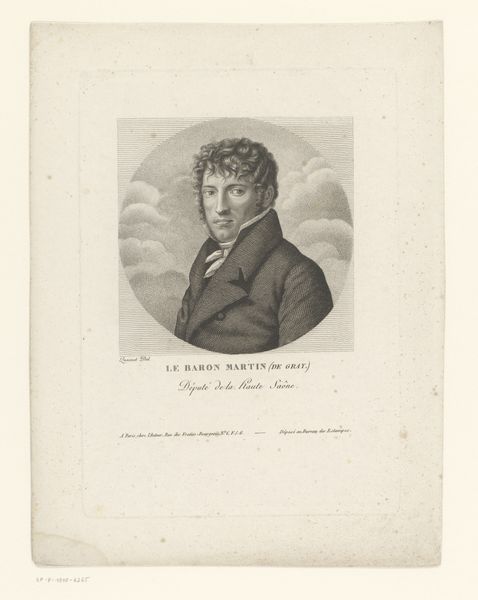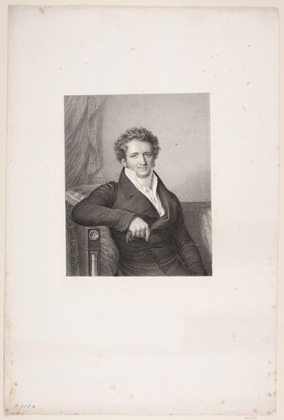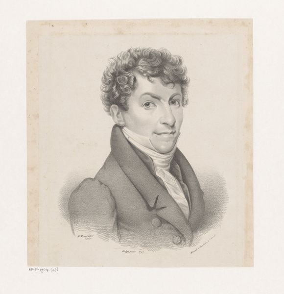 Curator: Here we have Eugène Verboeckhoven’s 1828 engraving, "Portret van Bartholomeus Johannes van Hove," housed at the Rijksmuseum. Editor: It's incredibly precise, almost photographic in its detail. There’s a subtle melancholy to his gaze. What can you tell me about van Hove? Curator: He was a Dutch painter and etcher himself. Looking through a critical lens, it's fascinating to consider their shared positionality within the art world— the socio-political factors informing their artistic choices. Do you notice the trace of history painting conventions in the portrayal? Editor: Absolutely. The engraver emphasizes a particular vision through very tactile choices: observe how the texture on the jacket and wall emerge due to the manual craft and manipulation of material. There are patterns within it. This reminds me of the wallpaper produced by William Morris. Curator: Indeed! And to unpack that material context, the act of engraving itself democratized image distribution, a shift impacting class and gender dynamics of the time. Who had access, who was being excluded or represented in stereotyped ways? Editor: These reproducible portraits were, in essence, commodities. We see the effects on society through how an artwork circulates. This man would like to represent something to a bourgeois public. Curator: It gives us a glimpse into artistic identity during a time when shifts were occurring in access to artmaking, which inevitably meant some changes to the social status and professional opportunities available to artists from diverse backgrounds. This work is exemplary, because it provides clear evidence on what shifts are appearing or becoming relevant. Editor: The interplay of artist and subject—both active agents—captured here serves as more than just a rendering; it reveals systems of commerce and value in society itself. Very well done. Curator: Agreed, a pertinent snapshot of their intersecting roles in shaping artistic landscape. Editor: I concur. This allows us a clear lens into the economic drivers that underpinned creative output.