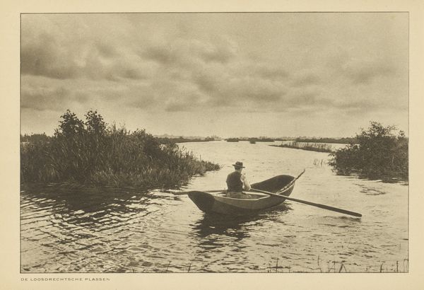 Editor: So, we’re looking at a gelatin silver print entitled "Gezelschap in een roeiboot van Hotel Wijkerburg, Voorburg" - or, "Company in a Rowing Boat of Hotel Wijkerburg, Voorburg," made before 1894 by Hendrik Herman van den Berg. There’s such a hazy, almost dreamlike quality to this photograph. It's more than just a picture; it feels like a little story. What strikes you when you see it? Curator: It’s a gorgeous captured moment, isn’t it? I find myself thinking about time itself, like a little rowboat gently gliding. There is that dreamy almost painterly quality which echoes impressionism... what’s interesting is the mix of leisure and labour – the elegant ladies contrasted with the men rowing… Makes you wonder about their relationships. Almost a staged genre painting, don’t you think? Do you get the feeling of the burgeoning leisure class enjoying a weekend excursion? Editor: I do, that division between labour and leisure definitely jumps out now. But what is that hotel doing there, painted on the boat? Was it common for businesses to advertise in such a way? Curator: Absolutely! Think of it as a historical advertisement meets snapshot. Ingenious, really! Free advertising as these boats meander through picturesque waterways, imagine the floating billboards this would create along with impressions made upon seeing the people riding it. Beyond the photograph itself, what about its resonance to our own culture – where we're still striving to find those little pockets of joy. That to me is what breathes life into this seemingly still image. Editor: I love how this photograph captures so many layers: society, leisure, and even advertising. It gives a tiny peep into the past with so much to tell us! Curator: Agreed! Sometimes the quietest images speak the loudest, don’t they? It's as much about what it shows as what it evokes.
