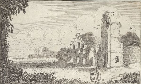 Editor: This is Sir James Thornhill's "Holdenby Castle ye South Front," created sometime between 1675 and 1734. It's a pen and ink drawing and I'm struck by how Thornhill uses line to create such a sense of depth and decay. What structural elements stand out to you? Curator: Note the interplay of geometric forms - the rigid rectangles and precise arches of the architecture against the organic, almost chaotic lines of the landscape. The architecture serves as the dominant form. Consider also the subtle tonal variations achieved through the hatching and cross-hatching. How does that contribute to the overall composition? Editor: It really emphasizes the contrast between the man-made and the natural, like nature is reclaiming the castle. Curator: Precisely. The contrast highlights the tension between order and disorder inherent in the image. Through line and form, Thornhill creates a compelling visual dialogue. Editor: I see the structure more clearly now. Thanks for pointing that out! Curator: A close viewing reveals so much.