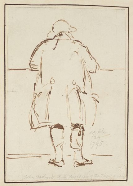 Curator: This is Aubrey Beardsley's "Portrait of Miss Letty Lind," a drawing rendered in pen and ink, and embodying much of the Art Nouveau style. What catches your eye about it? Editor: She’s… playful? Definitely unconventional. It feels like she’s stepped out of a whimsical dream, all big, baggy clothes and a mischievous smile. Is that a hat she's holding? There's a certain lightness, even though the lines are so deliberate. Curator: That lightness is characteristic of Beardsley’s genius with line work. Observe how a simple, almost sparse, contour defines her voluminous coat and suggests her form beneath. It speaks to the Symbolist movement’s concern with capturing the essence of a subject rather than its literal representation. Editor: True! The coat IS pretty imposing. Almost cocoon-like. Does it maybe represent the public persona she's donned as a performer? Curator: Possibly! The coat itself carries multiple layers of meaning, concealing and revealing at once. Also, the background details provide some insight: the easel and stool situate her within an artist’s studio. Miss Lind herself was a famous stage actress, and Beardsley was known for portraying celebrities of his time. Editor: Ah, a glimpse behind the curtain! I get this feeling that she’s more than just a portrait subject. It’s like we’ve caught her between acts, slipping into a quieter, almost secretive space. Her half-smile seems knowing, somehow. Curator: Exactly! Beardsley excelled at evoking the ambiguity of his subjects, suggesting hidden depths. Here, the stark black lines against the white paper intensify that ambiguity. Notice, too, the intentional void that encompasses much of the space. What significance do you find in that visual void? Editor: It feels a bit stark. But then again, that emptiness sets her apart even more, isolates her in her world, inviting our imagination to fill it with its own story. Curator: Beardsley challenges us, doesn't he? To question our assumptions and see beyond the surface. Editor: He really does. It makes you wonder what Letty herself thought of the piece. I imagine she must have seen a side of herself captured in the line she wasn’t aware of. Curator: A fitting mystery, I’d say. It captures the complex exchange between artist, subject, and audience, suspended in a perpetual moment of revelation. Editor: Nicely put. A fittingly Beardsley touch to end with, wouldn't you say?