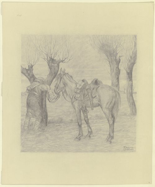 Otto Hanrath made "In de hooistal" using hatching and cross-hatching techniques. It's amazing how he builds tone and form with what is essentially a network of lines, a process that reminds me of my own painting where I start with a loose sketch and let the image emerge. Looking at the horse, you can see the density of the marks giving it shape and weight. The lines are so tactile, almost like feeling the texture of the hay itself. It’s not just about representation but about recreating an experience. The woman on the left, with her arms crossed, is rendered with such clarity, she looks like someone I might know. Similarly, the elder man seems lost in thought, as though he and the horse are sharing a quiet moment of rural contemplation. This reminds me a little of Käthe Kollwitz, with that same investment in humble scenes and figures. Hanrath shares her love of drawing, and the power of a simple mark to say so much.