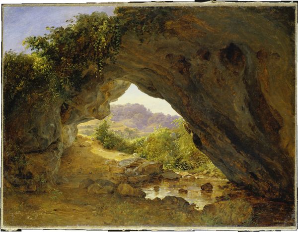 Editor: This is Joseph Wright of Derby's "Cavern, near Naples", an oil painting. The overall feeling I get is one of serene stillness, broken only by the suggestion of distant light. How would you interpret this piece, focusing on its artistic composition? Curator: Formally, observe how Wright frames the distant vista within the dark recess of the cavern. The cave's jagged forms, rendered in warm earth tones, create a textured contrast with the smooth, cool hues of the water and sky visible beyond. The play of light here is crucial, accentuating the cavern’s depth and directing the eye outwards, from shadow to luminescence. Editor: Yes, the way he captures light is quite something! Do you think the size of the cave entrance affects the perception of the wider landscape? Curator: Precisely! The relatively narrow opening acts as a compositional device. By constricting our view, Wright heightens the impact of the scene beyond, almost theatrical in its presentation. Moreover, note how the arrangement leads the gaze in stages - foreground to background. Do you perceive any relationship between forms? Editor: Now that you mention it, the curving rock shapes seem to mirror the shape of the bay and the mountain in the background, creating a unified visual experience despite the contrast in light. I never noticed this before! Curator: Indeed. These compositional echoes, or resonances as I like to call them, work together to produce the painting's pleasing harmony. Notice how carefully Wright arranges masses and planes of tones. Editor: Thanks, that gives me a whole new appreciation for how this work achieves its harmonious effect. I'll definitely be paying more attention to composition in landscape paintings going forward.