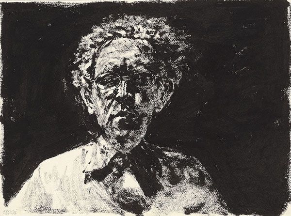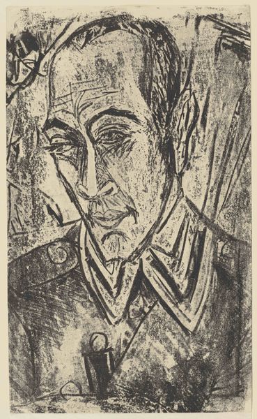 Editor: Here we have Tony Bevan's "Portrait Man," a stark black and white image. The lines are so harsh, creating a sense of unease. What do you see in the composition of this work? Curator: The striking use of contrasting tones structures the visual field. Note how Bevan deploys line not just to delineate form but to create texture and psychological depth. The hatching technique, for example, provides a tangible quality to the subject’s clothing. Do you observe how this contrasts with the face? Editor: Yes, the face seems more vulnerable, exposed almost, compared to the densely patterned shirt. I hadn't noticed that before. Thanks for pointing that out! Curator: Indeed, it's through these formal choices that Bevan evokes a powerful, if unsettling, presence.