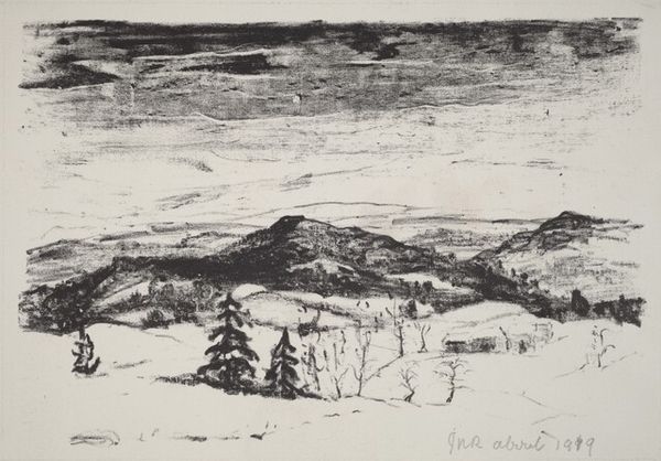 Editor: This charcoal drawing is titled "Winter Landscape" by Istvan Nagy, created in 1927. The muted tones really set a somber mood, and the landscape is quite desolate, with only a few trees dotting the hills. How would you interpret this work? Curator: It's interesting you use the word "desolate." For me, the beauty resides in how Nagy employs darkness, not merely to depict a literal winter scene, but to evoke a kind of psychological or spiritual starkness. Charcoal, with its primal connection to earth and fire, is perfect for this. What feeling do the repetitive lines used to form the hills evoke in you? Editor: A sense of unending, almost monotonous, waves perhaps? There's a definite rhythm to them. Curator: Exactly. The rhythm echoes a deeper, cyclical truth about nature – the relentless turning of seasons, life, death, rebirth. Look at how the darkest marks cluster around the trees, almost shrouding them. What do trees often symbolize? Editor: Life, growth, but also family and heritage, right? Here, they seem fragile. Curator: Precisely! Think of this in the context of the interwar period, 1927. There was economic hardship, displaced populations and societal anxiety. Could those trees represent a struggling population clinging to their roots? Nagy seems to be communicating beyond the immediate landscape. Editor: I never thought about the historical context adding another layer to it, a cultural memory almost. It makes the piece so much more profound. Curator: The symbol itself, the landscape, holds the emotion; it acts as cultural memory. A drawing can indeed be very powerful. Editor: Thank you for sharing that; it definitely shifts my perspective on the artist's choices.