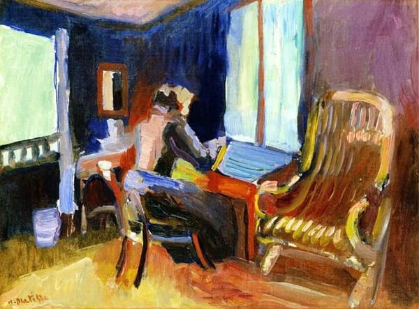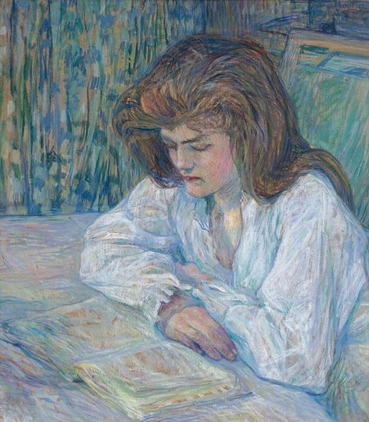Armand Guillaumin painted Mademoiselle Guillaumin Lisant, using oil on canvas to create this intimate domestic scene. The composition is carefully structured, drawing us in through a complex interplay of vertical and horizontal lines, softened by the vibrant colours and textured brushstrokes. The painting is divided into distinct zones: the patterned curtains to the left, the dark, rectilinear bookcase behind the figure, and the light-filled space around the fireplace on the right. This division creates a push and pull, destabilizing the traditional single-point perspective. Guillaumin seems to question fixed ways of seeing and representing space. The brushstrokes, thick and visible, reject any illusion of smooth representation, asserting the materiality of the paint itself. The juxtaposition of complementary colours such as the yellow flowers against the blue-tinged fireplace, enhances the visual tension, and encourages a reading of the painting as a dynamic interplay of form and colour, rather than a mere depiction of reality. It is this tension between representation and abstraction that defines much of modern art.