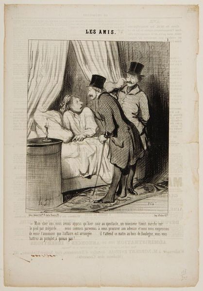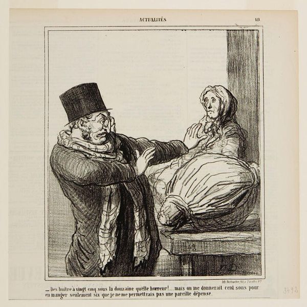 Editor: This is a lithograph by Honoré Daumier, titled "You don't want anything?" "No, I'm afraid..." "Let's have a tot of laudanum!". The cross-hatching creates such varied textures. What do you notice about its composition and the artist’s technique? Curator: Observe how Daumier uses line to delineate form and character. The exaggerated features, particularly the eyes of the figure in the center, convey a sense of unease. How does the stark contrast contribute to the overall mood? Editor: The dark lines definitely amplify the tension. Is the contrast purely aesthetic or symbolic? Curator: Both. The starkness emphasizes the moral commentary inherent in Daumier’s work, reflecting societal anxieties of the time. Do you find that the interplay of light and shadow intensifies the narrative? Editor: It does. I hadn't considered how much the technique reinforces the subject matter. Curator: Indeed. By focusing on the formal elements, we can gain deeper insight into the artist's intent and the social context.