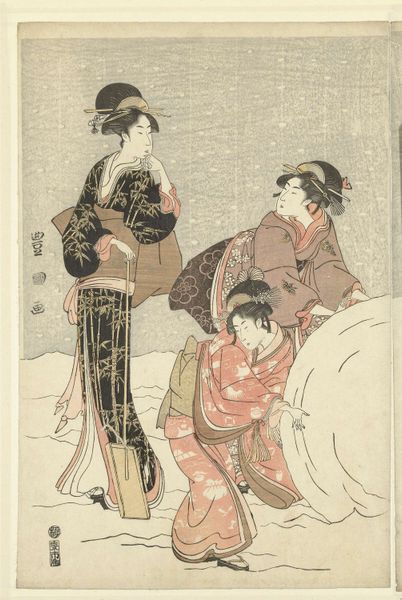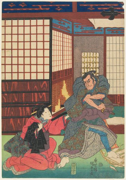 Curator: Looking at this piece, I am struck by the palpable anxiety emanating from these figures. There’s a real sense of unease. Editor: This is a print by Utagawa Kunisada. While his exact birth year is debated, we know he worked between 1786 and 1864. It is simply titled “Print” and can be found at the Metropolitan Museum of Art in New York. The cultural memory embedded in these images can guide viewers closer to how those depicted were perceived. Curator: Kunisada masterfully uses color to amplify those underlying emotional currents. The teal and lavender hues of the garments clash, creating a visually jarring experience that mirrors the internal conflict visible in the figures’ expressions. The arrangement of their limbs – so angular – amplifies the tension. Editor: As a master of ukiyo-e, or "pictures of the floating world,” Kunisada’s print offers us a glimpse into Edo period Japan and the representation of women within its social structure. The exaggerated expressions were important in conveying the emotional intensity and story of the play. Curator: Ah yes, and that stylized depiction points to a codified understanding of beauty and status. Note how the exaggerated features of the courtesan communicate both power and vulnerability in equal measure. Do you think it is important that he chose to immortalize this kind of performance for posterity? Editor: Well, prints like these served as a form of visual media. While Kunisada captured idealized representations, they often were more about shaping public perception through the socio-political role art played and who controlled the image, than the historical context. Curator: Even if those historical representations weren’t exactly accurate, I am drawn into a complex interplay between artifice and genuine emotion, wouldn’t you agree? This has been a productive experience, thank you! Editor: Agreed, Kunisada's Print is much more than a static artifact, it continues to engage viewers and spark discourse, even centuries after its creation. It's what gives us, the public, permission to understand past historical dynamics.