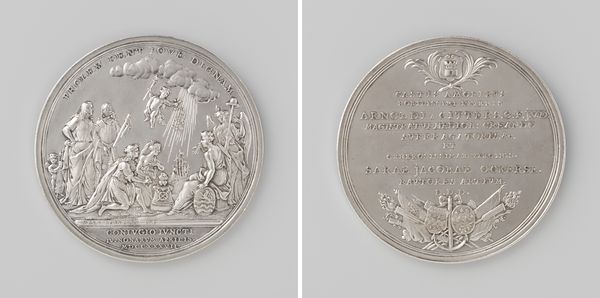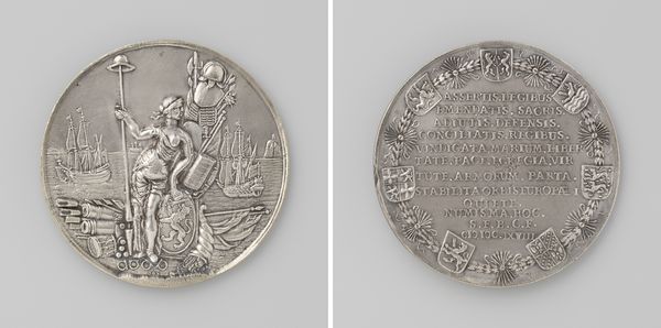 This silver medal, commemorating the "Vierdaagse zeeslag", or Four Day Sea Battle, was made by Christoffel Adolphi sometime in the 17th century. The creation of this medal was no simple task. The design was first engraved in steel dies. These were then used to strike the image into the silver, with considerable force. This process, requiring skilled hands and specialized tools, highlights the value placed on craftsmanship during the period. Note how the metal is used to capture the intensity of naval warfare. The ships in conflict, clouds of smoke, and inscription are meticulously rendered in low relief. Beyond its artistic merit, this medal reflects the social and political context of its time, specifically the Dutch Republic's naval power and its maritime conflicts. The metal itself embodies economic capital, literally. Thinking about the labor, tools, and tradition involved in the creation of this medal allows us to appreciate it not just as a piece of fine art, but as a testament to the skills and values of its time.