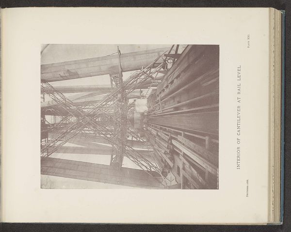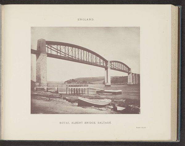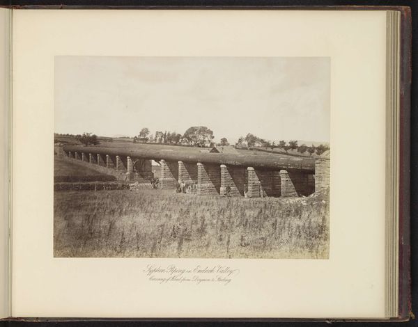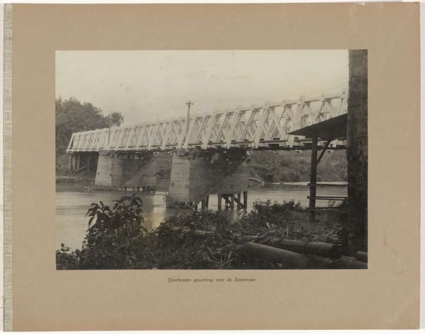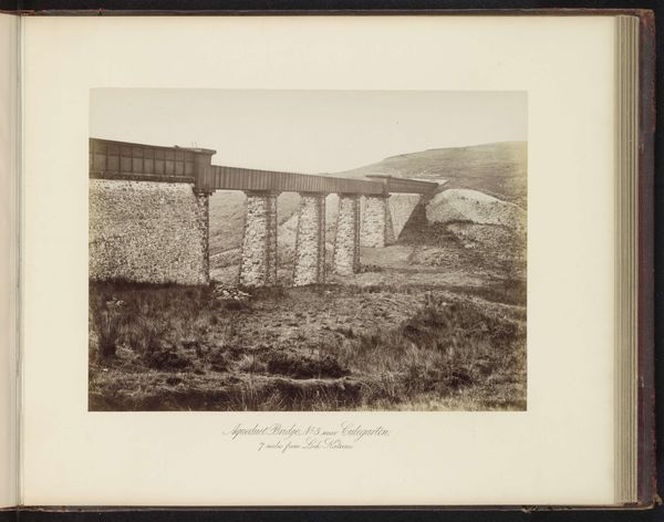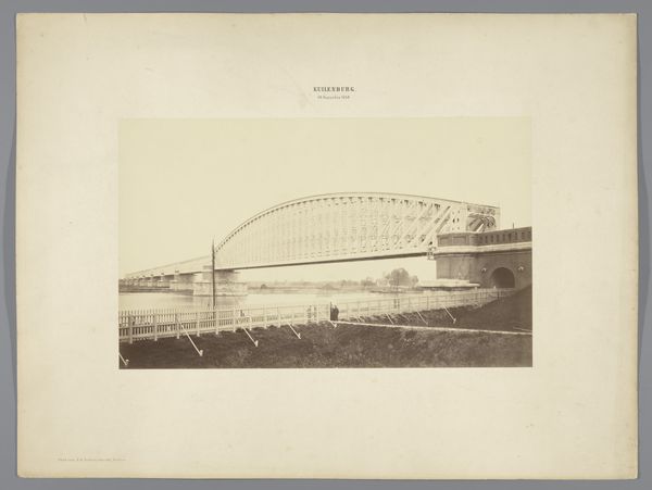 Curator: This albumen silver print, by Timothy O'Sullivan, captures the High Bridge crossing the Appomattox River near Farmville. Editor: It feels unfinished, like a ruin, or some skeletal beast emerging from the earth. Stark and almost unsettling. Curator: The bridge becomes a potent symbol here. It’s about infrastructure, certainly, but also of bridging divides—both literally and metaphorically in a post-Civil War context. Editor: It’s industrial and desolate, though. It lacks a human element, which makes the idea of "bridging" feel almost futile, or at least incredibly difficult. A symbol of monumental effort. Curator: Perhaps, but consider the light. It gives a sense of hope, doesn't it? A visual echo of the potential for rebuilding, for connection despite past fractures. Editor: I suppose. But I still feel a weight in those shadows. It’s a reminder that progress always carries the ghosts of what was lost. Curator: A poignant observation, indeed. Editor: Yes, a heavy reminder.