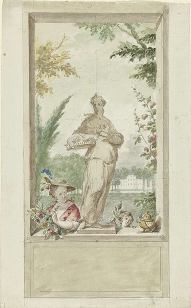 Editor: This is *Design for a wall panel: Amaryllis Recognizes Myrtillo*, a Rococo drawing in pen, watercolor, and paper by Dionys van Nijmegen, sometime between 1715 and 1798. It feels... fragile, like a faded memory. What symbols do you see here? Curator: This is fascinating! Look at the story being told through these figures. The narrative is drawn from classical mythology, of course. Note how van Nijmegen uses the image of recognition to explore identity and disguise. Do you recognize elements that represent idealized love, pastoral landscapes, and the unveiling of true nature? Editor: I think so. The women certainly seem to be revealing something. Is that typical of the era? Curator: Yes. During the Rococo period, mythological scenes were often used to reflect societal values, particularly around courtship and virtue. The landscape isn’t just a pretty background. Ask yourself: how does nature mirror or influence human emotions in this scene? Editor: It does feel very idyllic. The trees, the rolling hills...it gives the figures space to express themselves. So the symbols here tell a story of discovering true identity and the importance of seeing beyond appearances? Curator: Precisely! It's like a dance between the visible and the invisible, reminding us that recognizing truth is often a journey, not a destination. The vase with the statue is a good example of the ideal in statuary versus reality represented by humans. Does understanding the symbols change your initial impression? Editor: Absolutely. It makes the artwork much more meaningful. Before, it was just a pretty drawing; now, it's full of layers of meaning and symbolism. I learned so much!