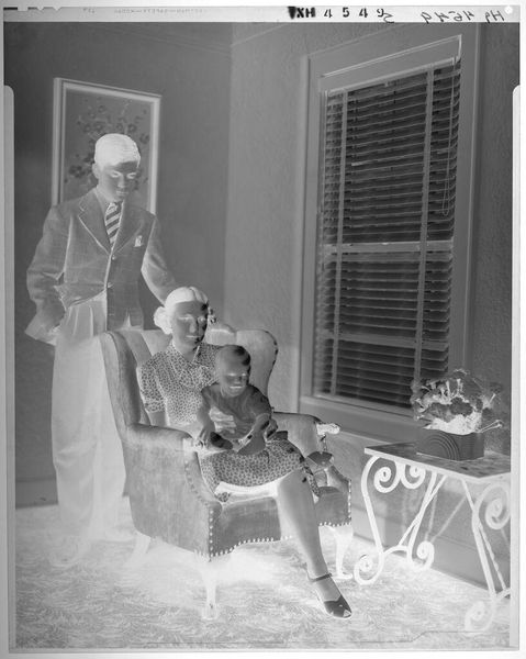 Editor: This untitled photograph by Lucian and Mary Brown shows a man and a boy playing baseball. The negative creates an eerie effect. What can you tell me about the materials and process used to make this? Curator: The materiality of photography is key. This print reveals a fascination with capturing fleeting moments, but the negative space also reminds us of the chemicals and labor involved in its production and consumption. How might the social context have influenced the Browns' choice of subject matter? Editor: It's interesting to consider the everyday labor of making photographs, especially in capturing such intimate moments. Thanks! Curator: Absolutely! Thinking about the materials and social context really opens up new perspectives.