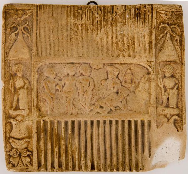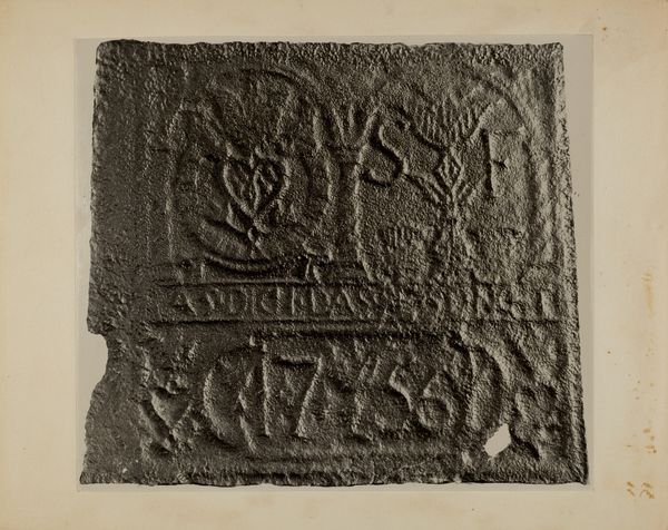 Editor: We're looking at a cast iron fireback, "Fireback", made in 1763 by the Colebrookdale Furnace. It's currently housed in the Metropolitan Museum of Art. Initially, it strikes me as surprisingly ornate for something that goes in a fireplace. All those symbols. What do you make of it? Curator: Well, isn't it just divine? Like stumbling upon a forgotten spell! This isn't merely an iron plate; it's a tapestry woven with the whispers of the hearth. Imagine the light dancing across those relief details – the tulips reaching, the heart emblazoned, the sun itself keeping watch. A little warmth, a little magic, right? Editor: So the motifs... I notice the date and the furnace name, obviously. What about the other symbols? What does it all *mean*? Curator: Ah, meanings! I can offer clues rather than concrete meanings! What if that heart represents the warmth and heart of the home itself, nestled in that period of craft? It might feel almost sentimental in a way. It's pure theatre – a daily performance of warmth and storytelling right there in your fireplace! Isn't it simply marvelous? And the geometric design at the bottom…do you feel a grounding energy there? Editor: Yes, a sense of balance, somehow. It seems... intentional. Functional, but elevated. Curator: Exactly! It shows how much intention these artisans possessed to render daily life a work of Art! The details encourage to make any ordinary domestic fire feel… sacred, almost? What did you make of this Fireback? Editor: I guess it's made me rethink "decorative arts". Not just decoration; but storytelling, making even functional items meaningful. Curator: It is that perfect moment where our everyday actions meet the Divine. A spark in a world on fire...