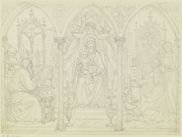 This drawing depicts the Annunciation with Beato Bernardo Tolomei di Siena. We see the Angel Gabriel offering the Virgin Mary a lily, symbolising purity and divine favour, while Mary sits, book in hand, representing her piety and studiousness. The gesture of Mary placing her hand on her chest is particularly evocative. This motif, resonant with humility and acceptance, echoes across centuries, appearing in various forms in both religious and secular art. Think of similar gestures in depictions of Roman emperors receiving tribute – a subtle shift from power to grace. This echoes a deep, subconscious understanding of reverence and reception. The emotional power lies in the delicate balance between awe and vulnerability, engaging viewers on a profound level. This symbol represents both acceptance and apprehension, resonating in the collective memory of humanity's encounters with the divine.