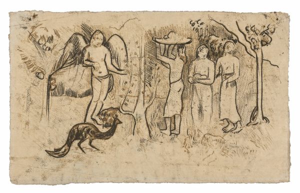 Paul Gauguin created this woodblock print titled, *Women, Animals, and Foliage* sometime in the late 1890s. Gauguin spent a considerable amount of time in Tahiti and sought to represent the island and its inhabitants in his work. Here, we see Gauguin's vision of Tahiti which is mediated through the lens of European art history. With its nude figures, verdant foliage, and idyllic setting, the print recalls the story of Adam and Eve. However, by replacing the traditional Christian symbols with Tahitian imagery, Gauguin challenges the Western gaze and celebrates the beauty and sensuality of Polynesian culture. This reflects a broader trend in European art at the time, in which artists sought to escape the perceived constraints of Western society by embracing non-Western cultures. To fully appreciate this work, we can consider the artist's biography and consult colonial archives. We can then start to understand the dynamics of cultural exchange that shaped Gauguin's art and the complex relationship between the artist and his subject matter.