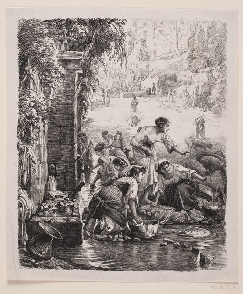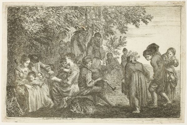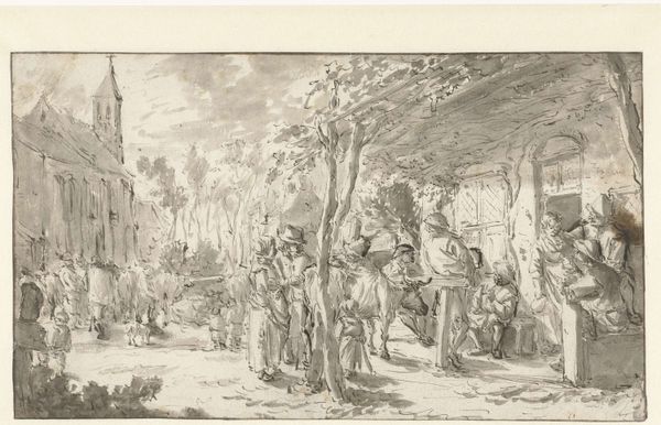 Cornelis Dusart created this etching, "Vioolspeler bij drinkend gezelschap voor een herberg," sometime between 1660 and 1704, offering us a glimpse into Dutch Golden Age social life. The scene depicts a group gathered outside a tavern, drinking and making merry to the music of a violin player. Tavern scenes were a common subject in Dutch art, often serving as a stage to explore the class dynamics of the time. Dusart, however, was especially interested in the lives of ordinary people. The artist's detailed rendering of the figures invites us to consider their individual stories and social standings. While appearing to be a snapshot of everyday life, the work raises questions about who is included and excluded from such jovial gatherings. Were women present? How was social harmony balanced with the realities of economic inequality? Dusart's etching serves as an invitation to reflect on the complexities of pleasure, leisure, and social cohesion in 17th-century Dutch society.