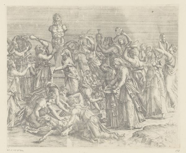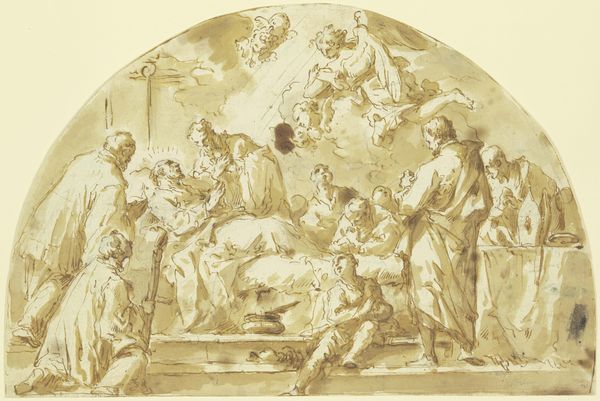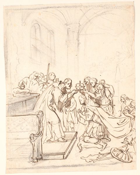 Gaspare Diziani created this pen and brown ink drawing, Christus reicht den Aposteln das Abendmahl, during the 18th century, a time when the power and authority of the church were both celebrated and questioned. Diziani captures the intimate moment of the Last Supper through a lens of hierarchical devotion. The apostles, embodiments of faith and masculinity, are arranged in postures of reverence and submission to Christ. In doing so, Diziani adheres to traditional representations of religious narrative which subtly promote the patriarchal structures of the time. Yet, what emotions might have been stirred in those observing this image, navigating their own complex relationships with religious institutions? This drawing acts as both a reflection of its time and a space for considering the intricacies of faith, power, and individual experience. The work invites us to consider the personal dimensions of these historical and social dynamics.