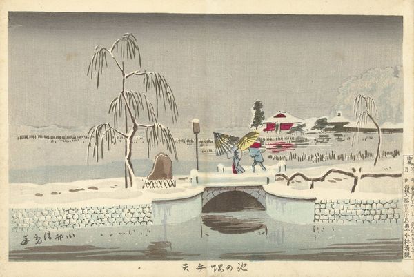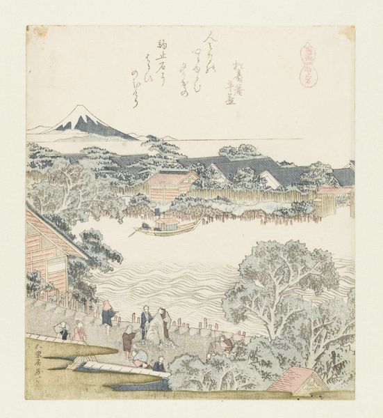 Curator: Hokusai’s woodblock print, “Het paardenheiligdom Komagatadô,” created around 1822, captures a serene slice of Edo-period life, currently held at the Rijksmuseum. Editor: The color palette is quite calming at first glance; subdued blues, pinks and greens give this landscape print an air of tranquility, although there's an awful lot happening within its composition. Curator: Indeed, let’s break that down. Notice how Hokusai employs distinct zones—the bridge in the foreground, the boats mid-ground, leading to the shrine architecture in the distance, establishing a sophisticated spatial order, each carefully layered with its own textural pattern and detailing. It is the formal harmony which elevates the imagery from that of a mere documentation of the space into one where all the forms exist as echoes of one another. Editor: I'm struck by the material reality of this piece. We're looking at ink on paper, meticulously carved woodblocks leaving impressions depicting a religious site; then there are all the laborers pushing their heavy loads across the bridge, as others do the same on water. There’s a very grounded sense of work and production contrasted with this serene place. Curator: And perhaps Hokusai’s work speaks to the inherent spirituality found in ordinary labor. The layering of symbolism—religious structure and landscape—reflects philosophical views about interconnectedness between physical action and higher purpose. Editor: Right, and in that context, consider the accessibility and reproduction of the woodblock print itself. This allowed ordinary citizens, and not just elite nobles or patrons, to own depictions of beautiful or spiritually relevant places, changing not only how the image itself functions but who has access. Curator: Absolutely, thus Hokusai's choices reflect both artistic expression, historical context and intellectual meaning. The layering within creates the work as both art piece and documentation. Editor: Yes, a great reminder that art always resides within webs of exchange and power relations and processes, influencing perception as well as access to culture. Curator: I leave appreciating the considered use of color theory, composition as well as subject matter that elevate the artwork as its lasting mark on art. Editor: Exactly, seeing not just pretty imagery, but its deep resonance throughout its complex methods and material construction changes your perspective, doesn't it?