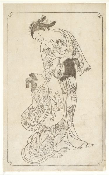 Curator: Look at this, isn’t it just… soft? Editor: Yes, a delicate scene. This is "Beauty Adjusting her Hairpin," a woodblock print created by Suzuki Harunobu around 1768 or 1769. It's currently held at The Art Institute of Chicago and is a lovely example of ukiyo-e art. The emphasis is on the fleeting moment. Curator: It’s funny, "fleeting" is a perfect word. There's almost a mournful sweetness. Is it just me, or is there a deep well of emotion in such simple compositions? Editor: Well, it is crucial to acknowledge how Harunobu reshaped ukiyo-e. His work appeared during a time of socio-economic changes, as merchant classes grew and disrupted the feudal structures. Harunobu, situating himself in this period, challenged gender norms with his sympathetic portrayal of female subjects and drew influence from earlier traditions like classical poetry to make these gorgeous, emotionally rich prints. Curator: I see the poem now in the woman’s posture. It’s all about line, the flow of her kimono echoing the arc of her arm as she fixes her hairpin. What’s she thinking? Daydreaming perhaps? It all makes me feel slightly nostalgic. Editor: Perhaps reflecting the shifting social roles of women in the Edo period. The details of her dress are a silent language and communicate much about her social position and fashion sensibilities. The work exemplifies a blend of genre painting and intimate portraiture typical of this style. We must remember, such representations, however beautiful, could also reify societal expectations. Curator: It's definitely a potent mix! I do like getting lost in this imagined narrative, especially considering the long history behind these prints. There’s a sense of both profound understanding and unknowability there. Editor: It invites that contemplation. It's beautiful how art from so long ago can resonate so deeply, initiating dialogue, and pushing against conventions.