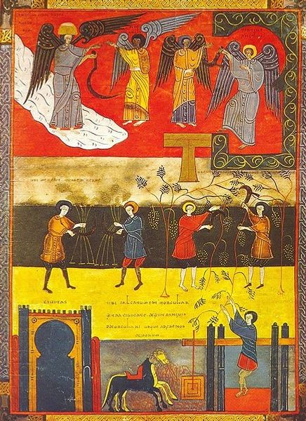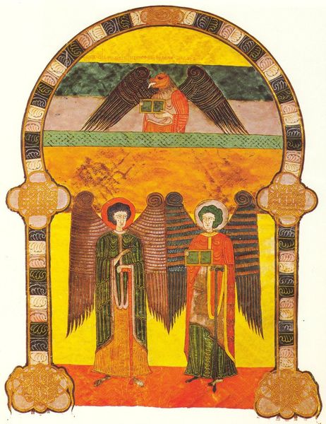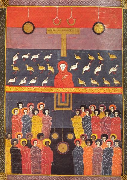 This painted page, *Adoration de Dieu*, was made by the artist Facundus around 1086, likely in Spain, using tempera on parchment. Here, the artist's choice of parchment is especially important. Animal skin provides a smooth, absorbent surface that invites the crisp lines and vibrant colors we see here. The tempera paint, made from pigment bound with egg yolk, creates a matte finish, allowing the intricate details to stand out. Consider the labour invested in preparing the parchment, mixing the pigments, and painstakingly applying each brushstroke. It’s easy to think of medieval illuminated manuscripts as simply a precursor to printed books. Yet, the time-intensive work, with the use of precious materials like gold leaf, also positioned these objects as statements of wealth and power. This work stands as a testament to the skilled labour of medieval artisans, and a potent reminder of the close relationship between materials, making, and meaning.