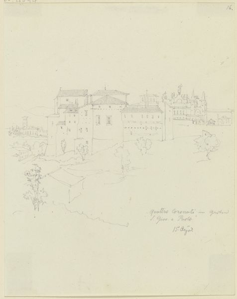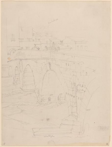 Curator: Friedrich Maximilian Hessemer created this pencil drawing, titled "S. Bartolomeo all’Isola mit dem Pons Aemilius in Rom," around 1828. It's currently held at the Städel Museum. Editor: There’s such delicate rendering, the subtle lines capture a Roman cityscape with such restraint. You can feel the atmosphere of the water around the buildings and bridge—and all in graphite! Curator: Hessemer's drawing reflects a Romantic sensibility prevalent at the time. Notice how the ancient bridge, the Pons Aemilius, serves as a poignant symbol of time and the enduring presence of history amid urban development. The view encapsulates a certain moodiness often favored at the time. Editor: It makes me think about the materiality of the ruins depicted—the individual stones, quarried, shaped, laid by laborers… What remains is this quiet, understated document, the pencil marks another trace of human intervention. The relationship between architectural form and the means to represent it visually is stark. Curator: Absolutely. Hessemer wasn't just interested in accurately documenting architecture. He was capturing its role within a larger social and historical narrative, making it about a historical record mediated through personal sensibility and artistic choices. And its placement on paper suggests it may be a maquette for something greater. Editor: But doesn't that understatedness almost challenge the grandiose narratives sometimes projected onto such subjects? By reducing the scene to its essential lines, the labor embedded is brought into focus rather than obfuscated by the sublime. It invites us to think about what's left out of the frame as well. What did Rome represent during that historical moment for the individual artist? Curator: That's a thought-provoking point. And the choice of a pencil sketch rather than, say, a more elaborate painting is intriguing when discussing value—was this made as a quick reference study, a work of art in its own right, or simply as a demonstration to somebody else? The pencil allows for both a sense of immediacy and reflection. Editor: Considering both artistic and industrial means together enriches our view. The delicate application allows Hessemer to speak both historically and poetically, simultaneously inviting reflection. Curator: It offers a valuable glimpse into how nineteenth-century artists and society viewed antiquity, and considered how it affects the development of the era. Editor: Precisely. Considering the hands, and the industrial processes that played a part, helps deconstruct these iconic structures as lived spaces.
