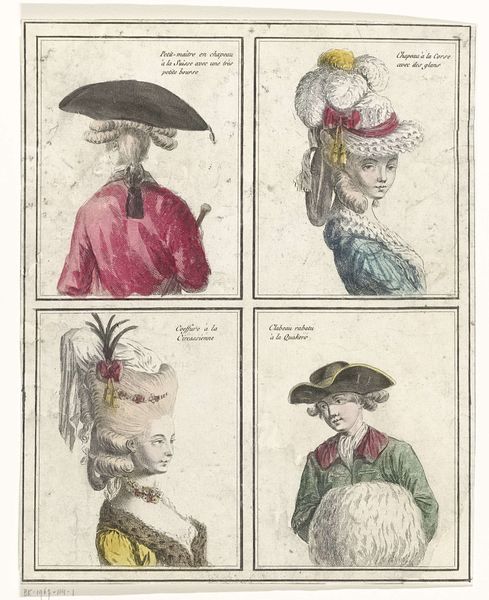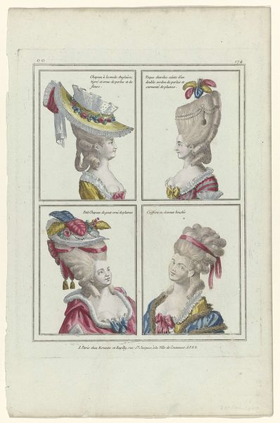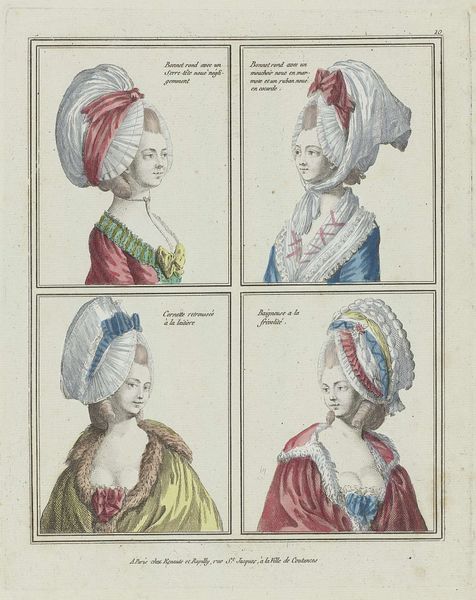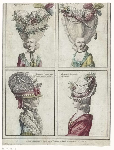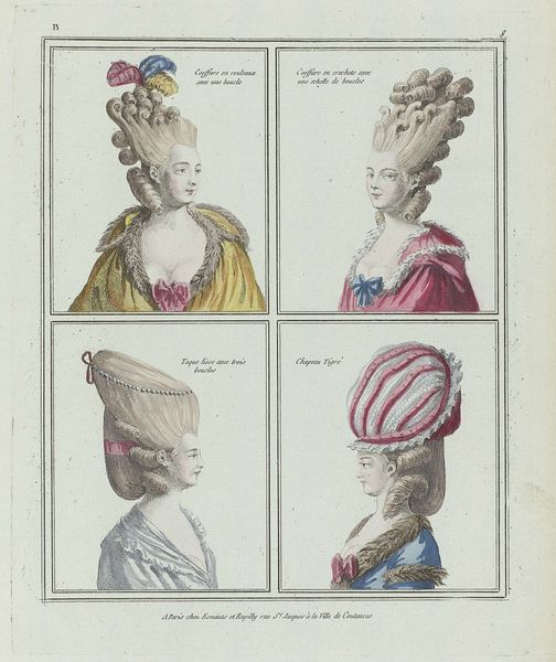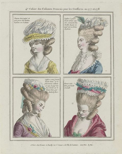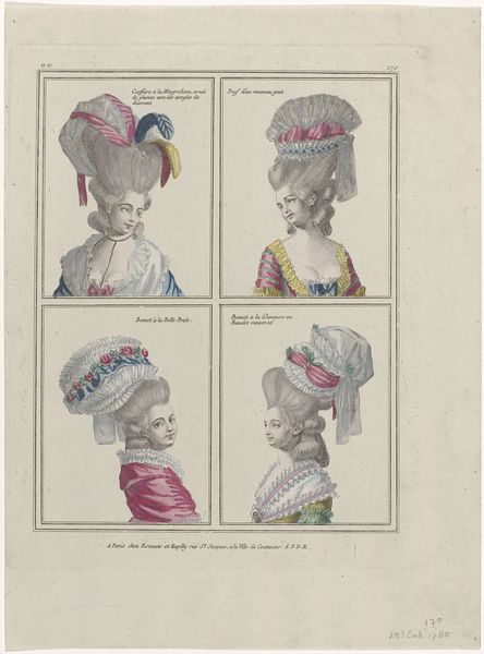 Jean Joseph Pelissier made this print entitled ‘Gallerie des Modes et Costumes Français’ in 1780, showcasing elaborate women’s hairstyles of the time. Here we see an image that's more than just fashion; it's a window into the social hierarchy of 18th-century France. These aren't just hairstyles, they are social statements. The higher the hair, the higher the status, quite literally. Think about the resources, the time, and the sheer labor required to create and maintain these towering coiffures. It speaks volumes about the lives of the aristocracy, removed from the daily struggles of the common people. This was also an era of salons and intellectual exchange. How might these extravagant styles have played a role in those spaces, signaling one's allegiance to certain social or political circles? Understanding this image means diving into the archives. Period fashion magazines, court documents, and even satirical prints can reveal the complex meanings embedded in these hairstyles. What seems like mere ornamentation is, in fact, a powerful form of cultural expression.