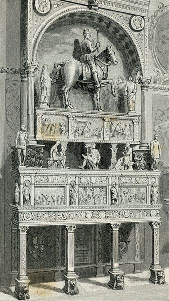 Editor: Here we have Giuseppe Barberis' "Camillo Cavour," from 1890. The print depicts what looks like a neoclassical sculpture. I’m struck by the allegorical figures, but I can’t quite piece together the narrative. How do you interpret this work? Curator: The entire monument acts as an emblem of civic virtue and national aspiration. See how the female figure kneels, offering a wreath? This is Italy herself, crowning Cavour, the statesman. The lion, of course, evokes Venice, but also fortitude. Do you see other repeating symbols here? Editor: I see some kind of writing on a stone tablet. And are those smaller sculptures at the base? Curator: Exactly! The inscription details Cavour's accomplishments. The lower sculptures depict scenes from his political life, reinforcing his role as the architect of a unified Italy. But look beyond the surface. What deeper themes are suggested here through these symbols? Editor: I guess it’s not just about remembering a historical figure, but also about building a national identity? The statue becomes a touchstone, solidifying certain values and ideals? Curator: Precisely. Each symbolic element contributes to a constructed memory. Even the choice of marble reinforces the idea of timelessness and permanence. In what way can portraiture solidify social concepts, like leadership? Editor: That’s fascinating. I hadn't considered how deliberate the symbolism is and how it works to construct a national narrative and memory. Thanks for clarifying this artwork’s importance! Curator: It shows how artistic language and the use of conventional symbology may transcend visual aspects. Understanding these nuances really enriches the experience.