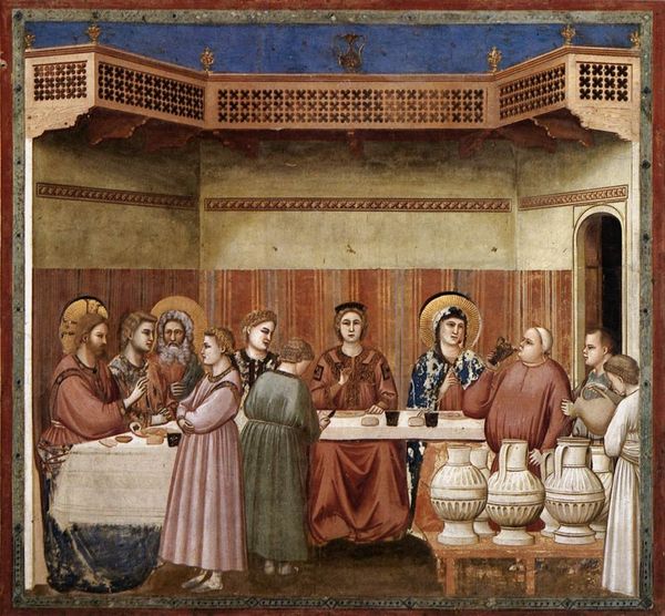 Curator: Welcome. We’re standing before Giotto's "Christ Before Caiaphas," a fresco painted around 1305. It's part of his incredible cycle in the Scrovegni Chapel in Padua. Editor: Immediately striking is the weight of this moment. Even across centuries, the accusation practically vibrates out of the scene. It's a stunning composition that fills the wall and makes you feel like you are also witnessing the spectacle. Curator: Absolutely. Giotto departs from the static Byzantine style to create figures with mass, emotion, and engaging gazes. "Christ Before Caiaphas" depicts Jesus's trial before the Jewish high priest. You'll notice Christ is surrounded and presented to the seated Caiaphas. Editor: Yes, and Christ's meek posture speaks volumes. It's interesting how Giotto positions Christ just left of center, with Caiaphas enthroned in what is almost regal green. The figures around them create chaos and consternation. One of the figures tears at their garments in condemnation. It's an intentional moment, staged by those who benefit from their position, no matter the cost to justice. Curator: This fresco, like the others in the chapel, was innovative. Giotto utilized naturalism; look at the attempts at accurate perspectives of the architectural elements and at the varying expressions on the faces. These details were intended to convey emotion to the viewers and align them with the suffering of Christ, very much setting a precedent for the upcoming Italian Renaissance. Editor: But it’s not just naturalism, is it? It's the carefully considered staging of power, which is so palpable here. And there's the use of color. Notice how Giotto subtly highlights the inherent drama and hypocrisy by shrouding those doing Caiaphas's bidding in darker shades compared to Jesus' light-colored robes. It is still such a modern and resonant image. Curator: Seeing Giotto’s radical and transformative frescoes is so illuminating because his style introduced a new chapter in painting that allowed art to take on a greater public role. Editor: Looking at “Christ Before Caiaphas”, it allows us to see that issues of power, truth, and the abuse of authority have persisted. I hope this provides a moment for reflection about how those issues impact all of us.