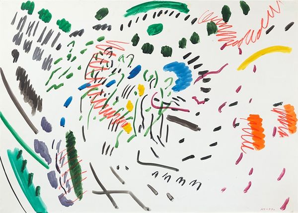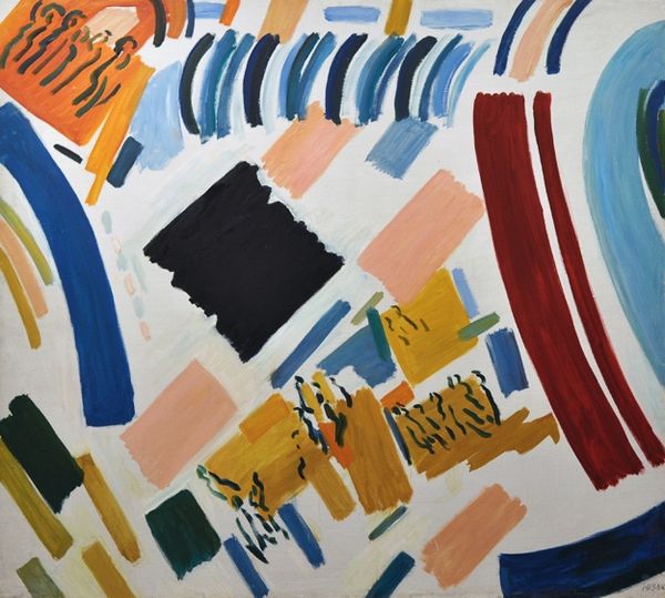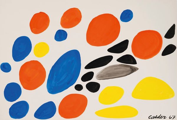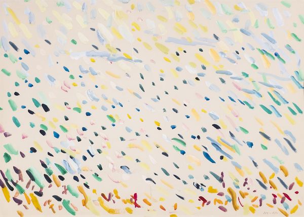 Curator: This is Yuri Zlotnikov’s “Composition #71” from 1982. Painted using acrylic on canvas, it is a vibrant example of the artist's signature geometric abstraction. Editor: My first impression is that it feels like a burst of summer, a playful arrangement of colors and forms. I sense dynamism but also a controlled energy, it's joyful and spontaneous. Curator: Indeed. Zlotnikov emerged as a key figure within the Soviet Nonconformist Art movement. Looking at this work, we must remember the socio-political climate of the time. Geometric abstraction provided a visual language that sidestepped direct representation, and, therefore, the stifling constraints of socialist realism. These forms were politically subversive. Editor: I am drawn to the recurrence of certain shapes. There’s the dash, the comma-like form. And that circular, almost embryonic shape nestled at the bottom right— it feels like a recurring visual motif, a symbolic language that speaks to cycles and continuity. It hints at a deeper psychological landscape beneath the surface of playful color. Curator: It's worth noting that Zlotnikov was deeply engaged with semiotics and systems theory, striving to create a universal visual language that could transcend cultural and linguistic barriers. The repetition of those 'dash' and 'comma' shapes, for me, evokes early experiments with computer programming and binary code— perhaps an early expression of algorithmic structures entering the collective consciousness. Editor: That brings a fascinating layer to my initial observation of cyclical forms, these micro shapes feel like they are hinting at life or beginning, they do offer an important code. These images can symbolize new cultural paradigms emerging. Even today we could see it as new technology, algorithms, even genetics. Curator: The deliberate composition offers more than simply vibrant arrangements of shapes. The use of contrasting color palettes—the cool blues against the warm reds and yellows, is critical to a system he constructed as a method to promote understanding and awareness. Editor: Well, thinking of Zlotnikov's symbols, colors, and arrangement – the totality of his construction and awareness that we can each gather differently by what each knows is its own kind of important. Curator: Ultimately, with the lens we’ve examined “Composition #71” a work that invites us to consider how artists use abstract languages to reflect upon socio-political contexts. Editor: And in thinking of this piece, Zlotnikov uses archetypal symbols that exist outside of time, they give enduring form to new technology and genetics of an old system.