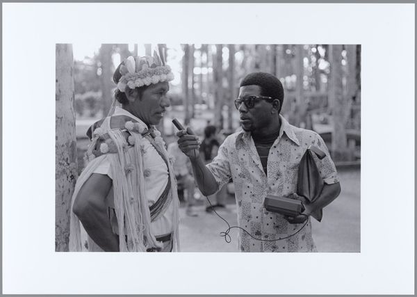 Editor: So, here we have Robert Frank’s “Youths in Rain—Indianapolis,” a gelatin silver print from 1956. The heavy shadows and the downcast faces create a really somber atmosphere, especially since it’s street photography which I would expect to be brighter. What stands out to you? Curator: I am intrigued by how Frank utilizes the umbrella as both a physical and symbolic shield. Rain, so often cleansing and life-giving, is here a burden. The umbrella becomes a communal canopy, shared yet isolating, creating an interplay between protection and confinement. Editor: That's interesting. Is it common to think about mundane items carrying significant meaning like this? Curator: Absolutely. Think about the way people dress in black to represent mourning, but those clothes do more than fulfill their purpose as fabric: they display an emotion to the world. Likewise, in Frank's photograph, the way these youths huddle and avert their gaze invites thoughts on community versus the individual experience. What emotional connections do you sense when viewing their expressions? Editor: It seems like there's a kind of shared discomfort or perhaps resignation in their faces. They’re physically close, but emotionally distant. Curator: Precisely. Frank captures a specific moment in American social history, hinting at underlying tensions through these individual portraits and group dynamics. Do you see the effect that has on your personal feelings, understanding more context? Editor: Definitely, seeing that tension in their faces highlights not just a rainy day, but a potential moment of wider conflict, which certainly changes how I perceive the scene. Curator: I believe that’s a testament to Frank's work – using everyday imagery to evoke cultural memory and challenge how we think of continuity. Editor: I never would have seen the image that way before; that’s very powerful, viewing it through the lens of social and emotional tension, beyond just documentation.