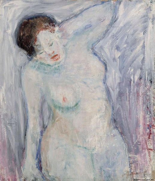 Editor: Here we have "Model on the Cliff" by Georg Pauli, an oil painting. I'm immediately drawn to the artist's brushstrokes and how the body seems to blend into the landscape behind it. What are your thoughts on this piece? Curator: Indeed, the fluidity of the brushstrokes is key to understanding its visual effect. Observe how the artist employs a limited palette, predominantly using flesh tones which merge and dissolve into the greens and blues of the backdrop. Notice how Pauli has juxtaposed the softness of the human form with the rugged suggestion of the cliff-side. How does that contrast strike you? Editor: I see what you mean. The figure and landscape share a commonality despite the hard edge of the cliff. Do you think the merging creates a sense of vulnerability in the figure? Curator: Vulnerability is an interesting interpretation. Formally, the figure is presented in contrapposto. It presents the undulation of line that draws the viewer's eye around the composition. Do you think the painter achieved visual balance? Editor: I'd say so, yes. The artist even manages to use the overcast sky to emphasize the pink of the figure. Curator: The tonal range is certainly subtle, lending a particular atmospheric quality. Now, think about the brushwork and the artist's layering of paint. What does the materiality tell you about the process of creating this piece? Editor: The brushstrokes suggest a sense of immediacy, like Pauli captured the scene in one go. Curator: It offers a compelling view of a body and land brought together. Editor: I never would have thought about it like that at first glance, but breaking down the visual elements definitely helps reveal a certain structural complexity in what appears to be such a straightforward painting.