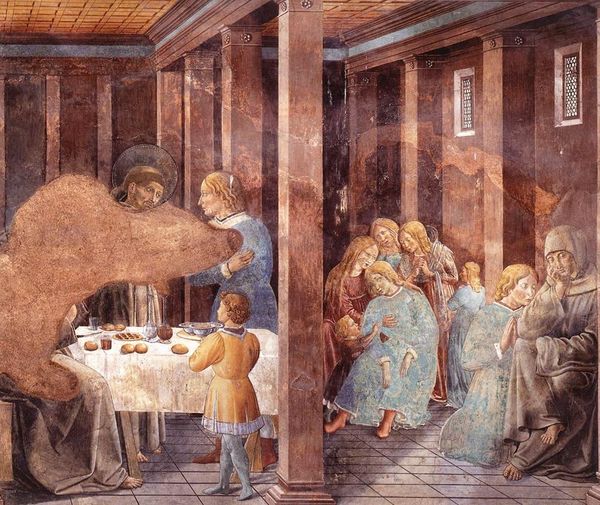 Curator: Let’s delve into Filippo Lippi's fresco fragment, "The Feast of Herod: Salome's Dance," completed around 1464. The muted tones and focused composition immediately strike me as a theatrical staging of power. What catches your eye first? Editor: The obvious focal point: Salome presenting the head of John the Baptist. What truly unsettles me is the almost nonchalant air surrounding such a gruesome act. Look at Herod – he barely glances at it. Curator: Indeed. Lippi's portrayal aligns with the Renaissance emphasis on perspective and drama, setting the scene in Herod's court as a tableau of controlled emotion despite the horrifying event. The power dynamics on display are quite striking if we consider that the act was to satisfy the desire of Herodias and her daughter Salome. Editor: Exactly. This is where the painting, even centuries later, speaks volumes about gender, agency, and societal expectations. Salome becomes a tool in a power game orchestrated by women denied other forms of authority, revealing how even victimhood can be weaponized. Curator: Fascinating how Lippi's masterful technique also reflects contemporary views on decorum and gender roles. Her garments and demure look make her the subject while she presents this gruesome object; simultaneously the subject and the object of violence. Editor: And that object, presented on a platter, signifies the cost of resisting authority – particularly patriarchal religious authority. It's a pointed reminder of the price paid for speaking truth to power, resonating even today in an age of censorship and oppression. The scene also asks viewers to recognize whose stories get silenced and who benefits from that silence. Curator: In observing how this single panel sits as a detail to the larger fresco we can ask about how history gets preserved by institutionalized authorities that seek to emphasize specific sociopolitical messages while simultaneously hiding others. The role of power brokers and image-makers in shaping perspectives becomes even more potent here. Editor: It definitely becomes important to see this beyond mere storytelling – this panel reflects how powerful, gendered figures are used for their social commentary purposes but also how that portrayal continues to perpetuate archetypes that should be seen as tools of oppression, rather than celebrated beauty or cunning power. Curator: That makes us think, doesn't it? Editor: Absolutely.