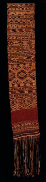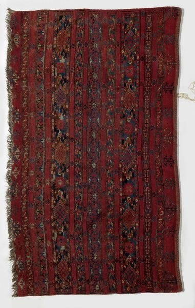 Curator: Well, here's a thing of beauty. This piece is called "Tentzakvoorblad", created around 1850 by the Tekke people. It's primarily made of textile and showcases intricate weaving techniques. Editor: Wow, it feels like looking at something deeply private. It has a warmth, like a cherished family secret, but there's also a bit of wear-and-tear to it, so a shared burden too. The colour's not as bright, either; there are a lot of reds that fade into browns. Curator: The palette is dominated by rich, earthy tones and demonstrates a sophisticated understanding of geometric patterns. Can you see how these repetitive motifs aren’t just decoration? Editor: Totally, the composition isn't random at all! Each of those repeating geometric shapes feels deliberate, each mirroring and offsetting its partners in perfect harmony. They seem connected, almost as if the motifs have the purpose to sustain the textile's composition. The weaver was definitely thinking symbolically; there's no question about that! Curator: Scholars have often interpreted such geometric designs as symbolic representations of tribal identity and cosmological beliefs. But there's something so human behind the technical achievement, right? Editor: Absolutely. I imagine the tent it adorned witnessed countless stories, and the fact it has survived speaks volumes about the human element. Think of all of those hands crafting and stitching over days. Curator: It really does transcend mere function, doesn’t it? It's both a historical artifact and a beautiful work of art. Editor: It feels incredibly personal too, because you could imagine it providing shelter, safety, protection, for those who dwell within. I would say I will never look at an old textile in the same way again. Curator: I couldn't agree more, let's move onto our next piece!