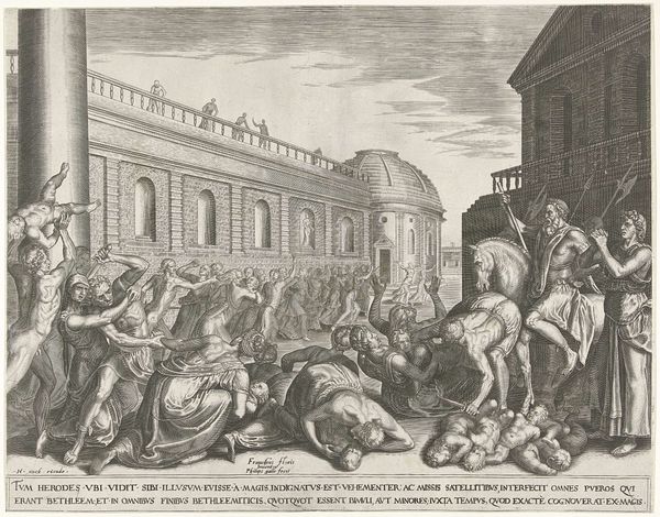 Curator: "Kortrijk ingenomen door de Malcontenten, 1580," made between 1613 and 1615, is an engraving by an anonymous artist. It’s quite a chaotic scene; bodies strewn about, buildings on fire… What draws your eye when you look at this print? Editor: The density, I think. The sheer amount of detail that someone was able to achieve with this engraving technique. All those tiny lines... what do you see in terms of materials and how they tell the story? Curator: Exactly. We see history being produced here, both in the content of the image and in the very labor-intensive process of its creation. Engravings like this were essentially mass-produced images. Consider the function of prints like this. Who was the audience? What kind of labor was involved? Editor: I suppose these prints served a similar function as news media does today, reaching a wider audience than painted works could. But who was doing the work, exactly? Curator: We don't know who made this particular print. Was it an individual craftsman, a workshop? The engraving itself required specific skills and tools. Copperplates were relatively expensive, representing an investment in disseminating this particular version of events. Think about the materials and processes necessary to reproduce these images – from the engraver's tools to the printing press. Editor: So, the consumption of imagery was tied directly to specific trades and technologies. It's less about the aesthetic skill of "an artist" and more about industrial image-making. Curator: Precisely! We see the social context of this historical event mediated through the materials and methods of artistic production. It compels us to consider not just what the print depicts, but how its production shaped its meaning and reach. Editor: It’s interesting to consider the socioeconomic factors that contributed to the production of this image rather than only seeing it as a depiction of an event. It's almost like an early form of photojournalism, shaped by commerce and distribution networks. Curator: Absolutely, seeing it as a commodity gives us valuable insight into its cultural significance at the time.