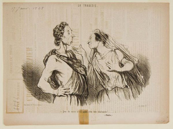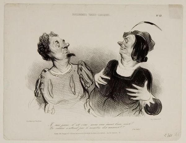 Curator: This is Honoré Daumier's lithograph, "Always beautiful! . . .". Editor: It has such a biting, humorous edge, doesn't it? The elongated features, the exaggerated expressions – it's caricature at its finest. Curator: Absolutely. Daumier used caricature as a tool for social commentary, critiquing the bourgeoisie of 19th century France and their obsession with appearances. Editor: I notice the woman's bonnet—it suggests an almost holy, iconic status, contrasted sharply by the man's knowing smirk, which feels almost devilish. Curator: Precisely. The visual cues point to gender dynamics and social power—the male gaze, the commodification of beauty—all deeply embedded in that historical context. Editor: Seeing Daumier's sharp observation, it makes you wonder, how much have those power dynamics really changed? Curator: Indeed. It's a potent reminder of the societal structures that persist even today. Editor: Well, it seems the symbols embedded within art can speak volumes across the ages.