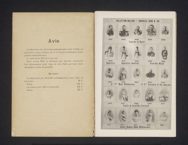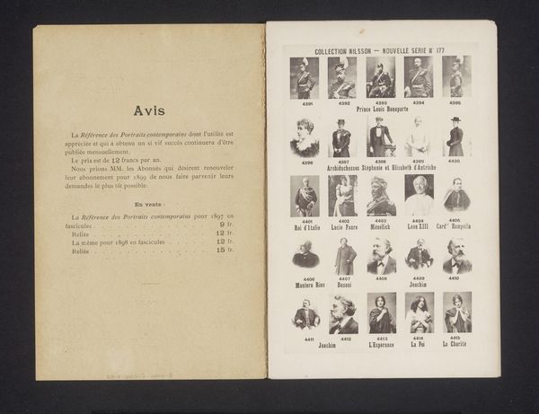 Curator: Here we have a fascinating item: a page from "Collection Nilsson, Nouvelle Série No. 209", showcasing portraits predating 1899. The portraits were captured using photography, then reproduced in a collotype print format. Editor: My first thought is that the arrangement feels incredibly utilitarian. The portraits, although distinct, are presented almost like product samples. A gridded display of the late nineteenth century’s prominent figures packaged for consumption. Curator: Precisely! It serves as a directory of notable individuals. It reminds me how visual imagery was disseminated and consumed, especially in the world of theater and literature. The presence of names like "Jerome K. Jerome," for instance, anchors it in that cultural landscape. They act almost like totemic representations of particular archetypes. Editor: The materiality, I find equally compelling. The collotype process, enabling multiple reproductions, makes me think about democratization of the image. This technology allowed these images of prominent figures to be widely distributed. Were these unbound sheets, like proof pages, circulated widely, or kept with others in bound editions? Curator: Given the text included here on the left side of the page it seems these are most likely collected into “fascicules”, almost like a magazine or partwork that a reader would bind together later. And while it democratizes access in one way, doesn't it simultaneously reinforce hierarchies? Those selected for portrayal, memorialized through image and print? Editor: Certainly. Even with its apparent accessibility, we still have to examine who has the authority to decide who’s worthy of depiction. Who's choosing what to showcase and the means of distributing these portraits? It reflects both technological progress and the persistence of societal structures of celebrity and recognition. Curator: Yes, by engaging with an object like this one, we aren’t simply observing portraits; we're studying how identities and their corresponding symbols were mass-produced and made consumable. What we are witnessing here is collective memory taking form in printed matter. Editor: And on this particular format, it tells us of the means by which late nineteenth century visual economies were structured. These images—objects circulated widely within their social, economic, and technological conditions—continue to echo to this day.