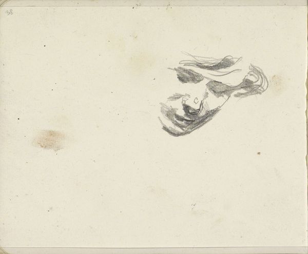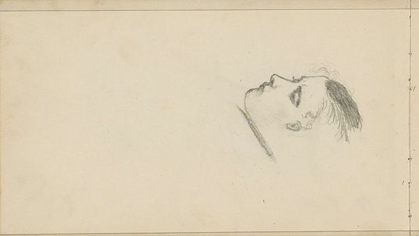 Curator: Breitner's "Gezicht, in profiel," or "Face, in Profile," dates roughly from 1886 to 1903. What strikes you about this particular pencil drawing? Editor: Rawness. Definitely raw. It’s a whisper of a face, quickly captured, almost hesitant. I imagine Breitner quickly sketching someone who didn’t know they were being watched. Curator: Precisely! It's from a sketchbook. You sense that intimacy immediately, don't you? Breitner's known for these candid glimpses into daily life. He wasn't trying to create a polished, finished product here. Editor: Which makes it even more powerful. The barest hint of the nose, the curve of the cheek... it tells us so much about the artistic process, about the way we perceive each other. Were these sketches preparation for his larger works, perhaps? Curator: Some likely were. He was constantly observing, always sketching. And considering his interest in the working class, the women especially, it invites considerations of power and representation, no? He gives them such focus without making them overly vulnerable. Editor: True, there's a remarkable balance here. We're given access, but on Breitner's terms, which, in a broader sense, echoes the male gaze that defined art in that era. How do you see that playing out? The profile itself almost serves as a screen. Curator: That's an astute observation. It shields the subject, certainly, maintaining a sense of her own interiority even as we, the viewers, try to understand her world through Breitner’s eye. He almost acts like a conduit. I'm always caught up on how simple the construction of that image really is though, and yet the form exists! Editor: Yes! Like peering through a keyhole. There’s so much implied, suggested. It also highlights the artist's choice, the perspective, whose gaze we're invited to share. Curator: Ultimately, for me, it is a study of perception and that is how it feels both incredibly modern and rooted in its time. Editor: For me, it is an echo that carries whispers of past lives and offers us insights on who holds the keys to interpreting such stories.