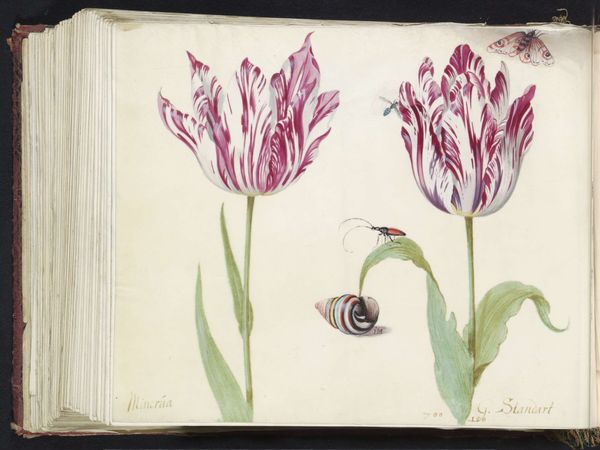 Jacob Marrel created "Two Tulips with a Grasshopper" using watercolor on paper. While undated, it's important to consider the cultural phenomenon of "Tulip Mania" in the 17th-century Dutch Golden Age. The tulip, originally from Turkey, became a status symbol and a speculative investment. Some bulbs were rarer because their striking colors were caused by a virus. People paid exorbitant prices, and the market eventually crashed. Marrel, as a flower painter, would have been deeply embedded in this culture of both beauty and economic risk. The painting invites reflection on desire, value, and fragility. The grasshopper is not merely a detail; it serves as a symbolic reminder of the ephemeral nature of beauty and wealth. It's a “memento mori,” a reminder of the fleeting nature of life. This image reflects the intense emotional and financial investment tied to these flowers, while subtly hinting at their inevitable decline.