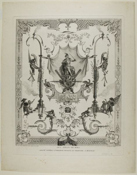 Curator: Jean Moyreau's "The Monkeys of Mars" presents a fascinating image. It's an engraving on laid paper, part of the Harvard Art Museums' collection. Editor: My first thought? It's whimsical, yet also unsettling. Monkeys dressed in military garb playing out scenes of war feels like a pointed commentary. Curator: Absolutely. These singerie, or "monkeyeries," were popular in the 18th century, a way to satirize human folly through animal stand-ins. Moyreau created this engraving after a painting by Watteau. Editor: The composition is so elaborate, with a central figure on a cannon, and monkeys enacting various roles within this militaristic setting. It makes me wonder about the public's perception of power and authority at the time. Curator: Indeed. These images offered a safe space to critique societal structures, using humor to address potentially sensitive topics related to class and political power. Editor: And seeing it today, that satire still resonates. The choice of monkeys is so effective in highlighting the absurdity of conflict and human behavior. I wonder what this says about the role of art in societal critique. Curator: It reminds us that art often functions as a mirror, reflecting our own behaviors and beliefs back at us, prompting reflection and, hopefully, change. Editor: It really does, doesn't it? "The Monkeys of Mars" still manages to provoke and challenge our perspectives on conflict and human nature even after all this time.