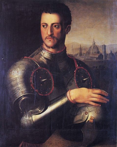 Editor: Here we have Agnolo Bronzino’s "Portrait of Cosimo I de' Medici," an oil painting from 1550. It's striking how much the gleaming armor dominates the composition. It really speaks of power, but I wonder, how did such portraits function in society at the time? Curator: That's an excellent question. These portraits weren’t just likenesses; they were carefully constructed projections of power and legitimacy. Think of the Medici family’s role in Florence and Tuscany at the time. Bronzino, as the court painter, was crafting Cosimo's image for public consumption. The armor isn't simply protective gear, it symbolizes strength, military prowess, and ultimately, his right to rule. What do you make of his expression? Editor: He looks rather…aloof, almost detached. It’s not exactly welcoming. Curator: Precisely! It reinforces the idea of a ruler set apart from the common people. Consider how these portraits would be displayed: in palaces, public spaces, intended to inspire awe and obedience. His gaze doesn't invite interaction; it commands respect. Do you think the style of dress helped contribute to those goals? Editor: Absolutely, his dress seems very elevated and aristocratic and must be meant to make his figure look incredibly important to his contemporaries and to us now. Is it unusual that he carries a helmet as well? Curator: No, that is another indicator of status and wealth. Notice how Bronzino has meticulously depicted every detail of the armor, showcasing the skill of the craftsman and, by extension, the wealth and sophistication of Cosimo’s court. But ask yourself, does the realism in the portrait help or hurt this projection of power? Editor: I see what you mean. On one hand, the realism makes him look like a real, tangible person. On the other hand, that only accentuates the almost artificial, untouchable aura. Curator: Exactly! These kinds of historical portraits can give you a new appreciation for propaganda! Editor: I never thought of paintings being propaganda before, that helps put his image into perspective.