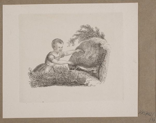 Editor: So, this is "Romulus en Remus gevoed door de wolf," an engraving by Christian Bernhard Rode, from around 1770. It has a slightly haunting feeling for me; the wolf is quite imposing and the babies look so vulnerable. What strikes you when you look at it? Curator: Vulnerable is a perfect word. I find myself drawn into the almost paradoxical tenderness in this violent landscape. Rode's choice to depict this specific moment – the nurturing by a wild animal – it tickles the imagination, doesn’t it? What kind of mother allows her children to be raised by wolves? What kind of wolf adopts human babies? Editor: Exactly! I mean, the myth is fascinating, but the *image* is really something. Is it common to depict this particular scene? Curator: Indeed. The story of Romulus and Remus is foundational, of course. Symbolizing Rome's origins, their strength coming from both nature and destiny. Here, Rode is playing with the dramatic contrast between the wild, untamed wolf and the innocent, pure babes. He seems fascinated by primal human desires and human fears of losing children in nature. Isn't it a wild dream? Editor: It really is! The more you talk about it, the more layers I see. At first, it was just an image of a wolf and two babies. Now it is like I can hear and smell it. The anxiety! Curator: Right?! Think about it; that wolf is also humanity, also Rome, a mixture of savagery and compassion. And that, my dear, is the enduring power of this old engraving. It makes you think and then it makes you feel.