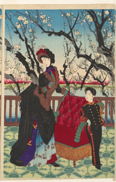 Editor: So this print is called *Peaceful Pleasures of the Highest Nobility*, created in 1887 by Inoue Yasuji. It's currently held at the Metropolitan Museum of Art. It feels a bit like a snapshot of upper-class life, but also very meticulously staged. What stands out to you most about its composition? Curator: The formal structure reveals a triptych format, each panel carefully delineating separate, yet connected, spatial realms. Note the repetition of vertical lines, from the architectural columns to the figures themselves. They impose a rigid framework onto an otherwise pastoral scene. Do you perceive how the use of colour blocking adds to this sense of structured organisation? Editor: I do see that now, the way distinct colours like blues, reds, and greens define different areas within the artwork. Does that choice suggest something specific about how Yasuji wanted viewers to engage with the print? Curator: The strategic application of colour serves not merely as a decorative element but rather as a formal device to articulate the composition. Notice the recurrence of the colours of interior decor in women's dresses: this emphasizes compositional links. Furthermore, observe the flat, almost stylized representation of form. This, divorced from concerns of realism, directs us to analyze the inherent pictorial qualities. Editor: It almost feels like a stage set, doesn't it? Very deliberate in its design and organization of figures and space. I hadn’t picked up on the echoing of the interiors in the fashions, though! Curator: Indeed. What is important here is the overall composition, the interplay of forms, and the very materiality of the print itself. Focusing on these qualities, rather than any narrative import, is paramount. Editor: I’m definitely seeing how the careful arrangement and use of color are key to experiencing the print in its totality. Thanks!