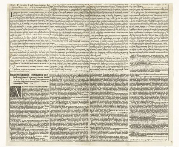Curator: Let's discuss this fascinating piece, “Leydse Courant van 30 januari 1807,” printed by the widow Anthony de Klopper and Son, sometime around 1807. It’s typography on paper, a fragment of a newspaper. Editor: The texture of this old paper is captivating. You can almost feel the fibers. Looking at this, I imagine the hands that printed this, setting the type, the physicality of producing the news of the day. Curator: Indeed. It's interesting to think about the social role of such printed materials. Newspapers were crucial in shaping public opinion and disseminating information during a time of significant political upheaval in Europe. How accessible would you say something like this was at the time? Editor: Given the literacy rates and the cost of materials, owning this particular newspaper was probably not for everyone. But there's still a democratic function; there is information for widespread distribution. The very act of printing facilitated a flow of ideas, a kind of intellectual raw material that was socially transformative. Curator: Absolutely. The newspaper itself becomes a site of contestation, reflecting power dynamics and offering a glimpse into the socio-political discourse of the time. And, the production would reflect specific modes of organization within the printing workshops. Editor: Think about it—the paper itself, handmade, probably. Each copy reflecting slight variations. The labor, the ink, the distribution network. What stories did they select? This edition provided an accessible summary to citizens, impacting their understanding of events unfolding around them. It grounds these abstract historical processes into specific, localized knowledge. Curator: These newspapers, therefore, hold significance beyond just the news they carried. They speak volumes about print culture and the public sphere in early 19th century Netherlands. They are remnants that illuminate the everyday experiences of individuals navigating their rapidly changing world. Editor: Precisely. By focusing on production, on the tangible qualities, we avoid just reducing it to textual content and can recover those otherwise easily ignored dimensions. I'll keep looking at it and consider my consumption choices as well.