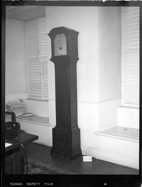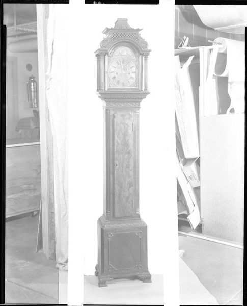 Curator: The "Longcase Clock," made by Samuel Toulmin, stands as a stark reminder of time's relentless march. Editor: My first impression is, frankly, that it’s monumental. It seems to dominate the room, a solid, functional piece with a sort of stoic presence. Curator: Yes, and think of the labor involved, from felling the trees to crafting the intricate gears. Each tick and tock represents countless hours of meticulous work. Editor: And those hands, sweeping across the enamel face – it's as if they're conducting the passage of our lives. It almost has a haunting quality, doesn't it? A tangible symbol of mortality. Curator: Maybe so. But also of the craftsmanship, the pride taken in building something so lasting. Editor: I see that. It’s a beautiful thing, truly. Almost makes you want to slow down a bit, appreciate the moment. Curator: Indeed. A testament to time, both fleeting and enduring.