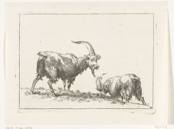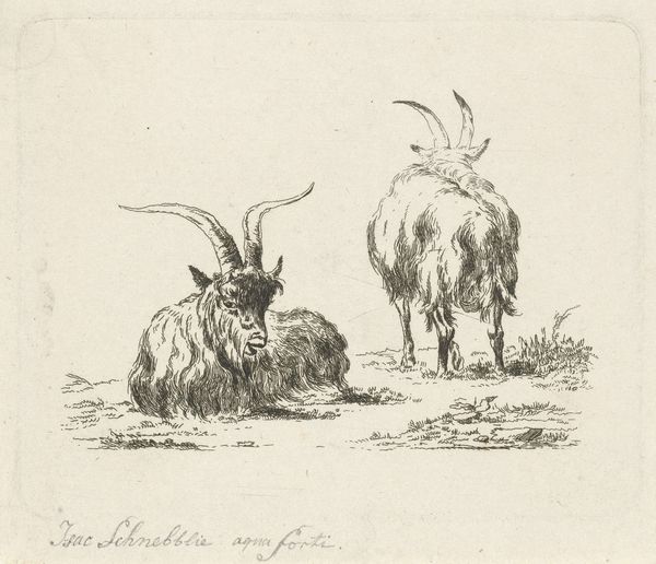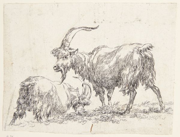 Curator: So, we're looking at "A Lying Goat and a Standing Goat Seen From Behind," an etching by Nicolaes Berchem, dating roughly from 1620 to 1683. It's currently housed here at the SMK. What's your immediate take? Editor: It feels strangely peaceful, almost meditative. The etching technique lends a kind of gentle softness to the goats' fur, doesn't it? And there's this inherent humor seeing a goat's rear end taking center stage. Curator: Berchem was deeply invested in exploring the relationships between the pastoral, the market, and emerging ideas around landscape. Think about the context: Dutch art was increasingly shaped by commercial interests and rising consumerism. Etchings like these served a dual purpose. Editor: You mean they were both artworks and, essentially, commodities? Curator: Precisely. The reproduction potential of printmaking allowed Berchem to reach a wider audience than, say, a unique painting. But let's consider the etching process itself. The marks, the deliberate construction…it points to a democratization of artmaking. He trained in Haarlem, surrounded by masters but also journeymen and print shops churning out images. Editor: That etching! It reminds me of summer days and animal smells—hay and fields after the rain. It is bucolic poetry. Also, have you noticed how Berchem’s lines bring life into them? I want to pet them so much, which is insane. Curator: Right, that sense of accessibility. Also it served specific economic functions. Landowners wanted images of their estates, of livestock and agricultural prosperity. A print was accessible even if the landowner's wealth wasn't shown on their face directly in the form of portraiture. The artwork served this function. The image of animal could communicate status and social standing through imagery of landscape. Editor: You are always analyzing from above. I understand that perspective, I am an Editor. What the landscape says to us. For me it's simpler, about those curves on the goats and shapes created through lines that capture the movement and presence. It's beautiful because of its immediacy and raw expression. Curator: It all coexists. It is not about which perspective takes prevalence. His choice of etching—relatively accessible, reproducible—suggests an understanding of his target market. Even the seeming casualness with the animal anatomy fits this frame of "approachability." It does give the impression to buyers that their art can become real and personal, but within their budget. Editor: Fair point. It just goes to prove art hits differently depending where you’re standing, or lying, like our friend here. I have this feeling he could speak any moment, with the words of a thousand summers. Curator: And maybe, too, an understanding that beauty and art, is about to shift, influenced by new means of material production.
