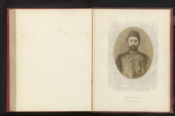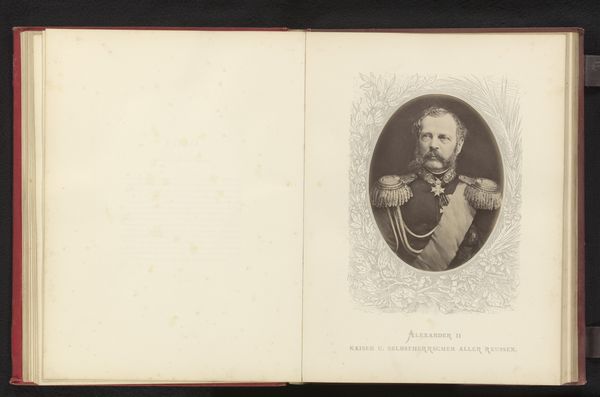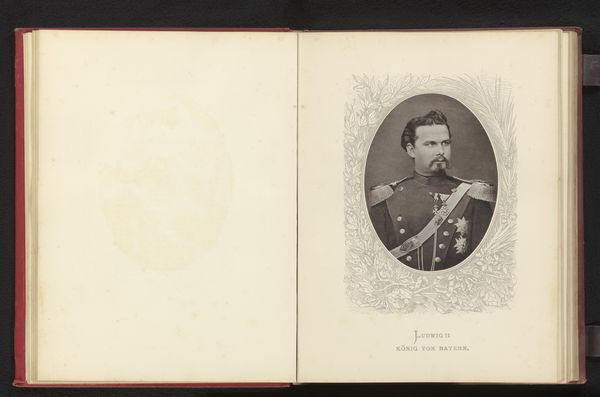 Editor: This is a photographic reproduction of a painted portrait of Leopold II, King of Belgium, created before 1880. It’s an albumen print displayed within the pages of an album. The king looks rather stern. What do you see in this piece? Curator: An albumen print capturing a painting, encased within album leaves…layers of representation mediate our view of Leopold. Consider the trappings of monarchy – the military garb, sash, medals, floral frame - symbols crafted to project power and legitimacy. But what feelings do those symbols evoke today? Editor: I see the attempt to project power, but it feels distant, maybe because it’s a copy of a painting preserved in this old album. It feels very mediated, as you say. Curator: Indeed. Photography was increasingly democratizing portraiture, challenging the traditional power structures upheld by painted portraits for the elite. Consider also Leopold's reign and its legacy within the Congo Free State. How do the symbols of royalty in the portrait interact with that historical memory? Editor: That’s a difficult question. There’s a tension. The portrait’s intended message of power clashes with the atrocities committed during his rule. The symbols now carry a weight of responsibility and a reminder of exploitation. Curator: Precisely. Images are not static. Meanings shift across generations, molded by cultural memory and reinterpreted by history. How does recognizing this context change your perception of the piece? Editor: It definitely complicates it. Seeing how the symbolism, once purely celebratory, is now deeply implicated in a painful history… It gives me a new understanding of how loaded images can be. Curator: Yes. It shows us the fascinating and sometimes troubling ability of symbols to endure and be reshaped by history.