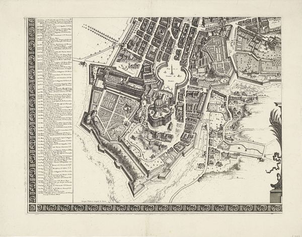 Editor: This is Giovanni Battista Falda's "Plattegrond van de stad Rome," created in 1676. It's a beautifully detailed print, almost like a bird's-eye view of the city. The sheer amount of information packed into this engraving is impressive. What stands out to you as you look at this piece? Curator: What I immediately notice is how the print mediates our relationship with Rome – not just as a physical location, but as an idea, a palimpsest of cultural memory. See how geometric the gardens are, mimicking ancient Roman planning but through a 17th-century lens? The print becomes a symbolic stage. Editor: A symbolic stage... Could you elaborate? Curator: Certainly. Each element—the meticulously rendered buildings, the strategic placement of gardens—becomes a character within a grand narrative. Falda isn't just documenting the city; he's consciously arranging its features to emphasize certain aspects of Roman identity – power, order, beauty. Look at the placement of specific structures, each one carefully considered within the composition. What message is conveyed? Editor: I see, it's like the architecture itself becomes a language, conveying ideas of Roman strength and artistic achievements to those who view it. I never really considered how maps could do that! Curator: Exactly! This "Plattegrond" isn't just about geographical accuracy; it's a carefully constructed statement about Rome's place in the world. What's more, it reveals something of the period in which it was created as much as the period it depicts. Editor: This has completely changed how I'll look at city maps from now on! Seeing it as more than a representation, but as a consciously crafted historical document. Curator: Precisely. Art always invites a deeper consideration, to recognize not just the subject, but its symbolic weight.