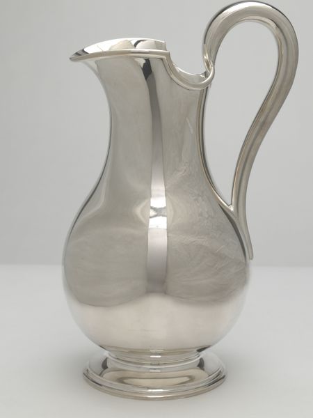 Curator: Here we have a late 18th-century wine decanter currently residing in the Metropolitan Museum of Art. My first impression is that this is all about elegant simplicity; a beautifully understated piece. What strikes you? Editor: I am fascinated by the socio-economic context of this wine decanter, specifically the labor that was needed to create it and its place within aristocratic life. The sleek form does belie its probable connection to extractive industry and silversmithing as an artisanal craft. Curator: True. While seemingly minimalist, its smooth, unbroken lines are very appealing. Consider the elegant curve of the handle against the bulbous body—a graceful dialogue between form and function. The proportions adhere to classical ideals, and it has these thin lines around the spherical body that emphasize its rotund shape. Editor: Exactly! Think about the social ritual surrounding its use – the act of pouring, the gathering of elites consuming. Also, silver itself became symbolic of prestige, connecting the aristocracy with natural resource exploitation. What meaning can we get from looking into this intersection of function and class distinction? Curator: Indeed, the choice of silver, beyond its lustrous aesthetic, signifies status. The reflective surface must have brilliantly caught the candlelight in aristocratic settings. And what about its Baroque-Rococo flair; an evolution towards asymmetry which this item hints at? It challenges a straightforward historical reading. Editor: Baroque and Rococo pieces signify opulence, with an overt display of wealth in aristocratic circles. We might see it as a rejection of older sensibilities through labor made to appear smooth. Its historical significance and beauty coexist through careful material selection to reflect society's desires. Curator: Very insightful. Its deceptively plain facade allows us to find a new appreciation for design which does not reveal immediately the social context from which it derives. Thank you. Editor: Indeed. Looking at the wine decanter helps to expose wealth as related to material practices in the olden days.