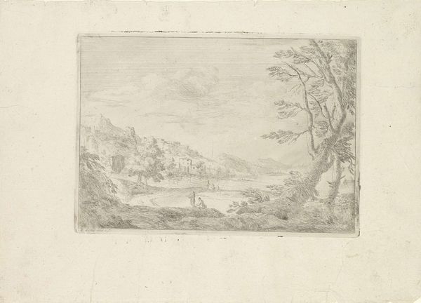Curator: Albert Christoph Dies' 1794 etching, "Lake Nemi," captures a classic Romantic landscape. Editor: It’s a really lovely composition. The texture created by the etching makes me think of a hazy summer day; the scene is tranquil. Curator: Look at the placement of figures within the natural elements—the trees, the rocks, and the ruin atop the distant cliffside. Dies skillfully positions these within the landscape, each carrying distinct associations of nature, protection, and the passage of time. The people gathered on the shore seem almost secondary to the looming symbolism of the landscape itself. Editor: Absolutely, but it's how those textures are achieved that fascinates me. It's clear that this landscape isn't just 'found,' but deliberately *made*. How was Dies' practice influenced by the increasing availability and demand for prints during this period? What type of paper was used and sourced from, and how accessible were etching tools? This impacts how we see the value, circulation, and even the artistic intention behind this specific image. Curator: I agree that it speaks to access, but consider the idealized form. It isn’t simply documentation. Lake Nemi and similar landscapes from this period evoke a very specific feeling—a sense of sublime awe in the face of nature's power, tinged with a wistful melancholy. Editor: Of course, it’s idealized. But that ideal also reflects the means available to reproduce the image—how quickly, how cheaply. Knowing those parameters re-grounds my viewing experience. For me, understanding those material factors gives us a fuller sense of its cultural value. Curator: And understanding the cultural context, the artistic and literary movements of the time, helps us unlock its symbolic richness. These elements worked together to create meaning that resonates through centuries. Editor: Precisely, it’s a confluence, one that only strengthens by including the labor and materiality involved in the making. It all connects, the symbols, the methods, and the hands behind the process. It alters how one engages with the work itself. Curator: An apt synthesis to carry with you as we move onward.