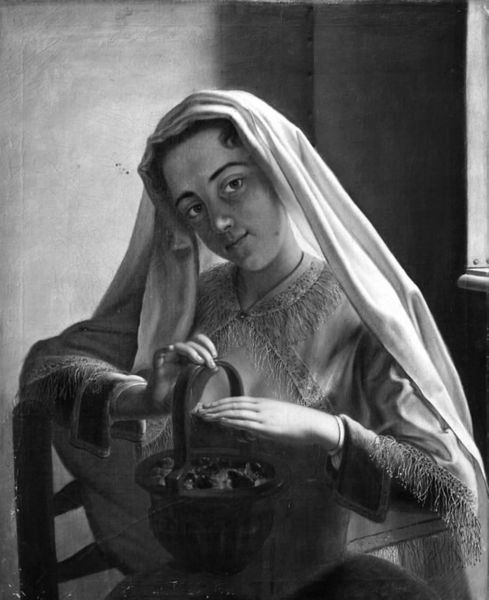 Curator: Standing before us is "Madonnahovede," painted sometime between 1792 and 1841 by J.L. Lund. It's held here at the SMK, the Statens Museum for Kunst. Immediately, I see serenity; there's a powerful tranquility radiating from her lowered gaze. Editor: Absolutely, I see that too. And it’s the light, or lack thereof perhaps, that’s making me think of Caravaggio, of all people. It feels…reverential in its starkness. That deliberate, dramatic use of black and white enhances the Virgin Mary’s image, creating an atmosphere of quiet contemplation. Curator: Yes! And the composition emphasizes her gentleness. Look at the soft drapery of the veil, it's cascading ever so gently over her head. There is this implied history painting here; that pensive moment when you are left to just be a young human bearing so much responsibility. Editor: Her hands clasped, her downcast eyes… it’s all deliberate. It really underscores the visual language of humility, which has been consistent in Madonna iconography through time. It’s powerful how consistent it remains. You almost feel her emotions. Curator: I completely agree; it evokes something primal and universal within us. And, you know, it might sound silly, but she looks tired! Like she has come down from that big, heroic mountain and is here now, for herself. Editor: That weariness might stem from the understanding of her son’s destiny; pre-ordained, written, the die is cast, etc. – her suffering is also integral to her story, and Lund has really made that present in his rendition. Curator: Looking at this, it does feel like the weight of that future, somehow already lives within her expression, not as loud crying but the quieter sorrow that comes with complete and full knowledge. What else is there to do than carry on with the day? Editor: Well, it has been fascinating diving a little deeper into this striking black-and-white painting and finding, behind it, layers of historical meaning and powerful cultural symbols. Curator: Yes, a profound dialogue captured with simplicity, and a delicate echo through time. It gives you a moment to just feel; no questions asked, only empathy, to feel like this may be something within you too.